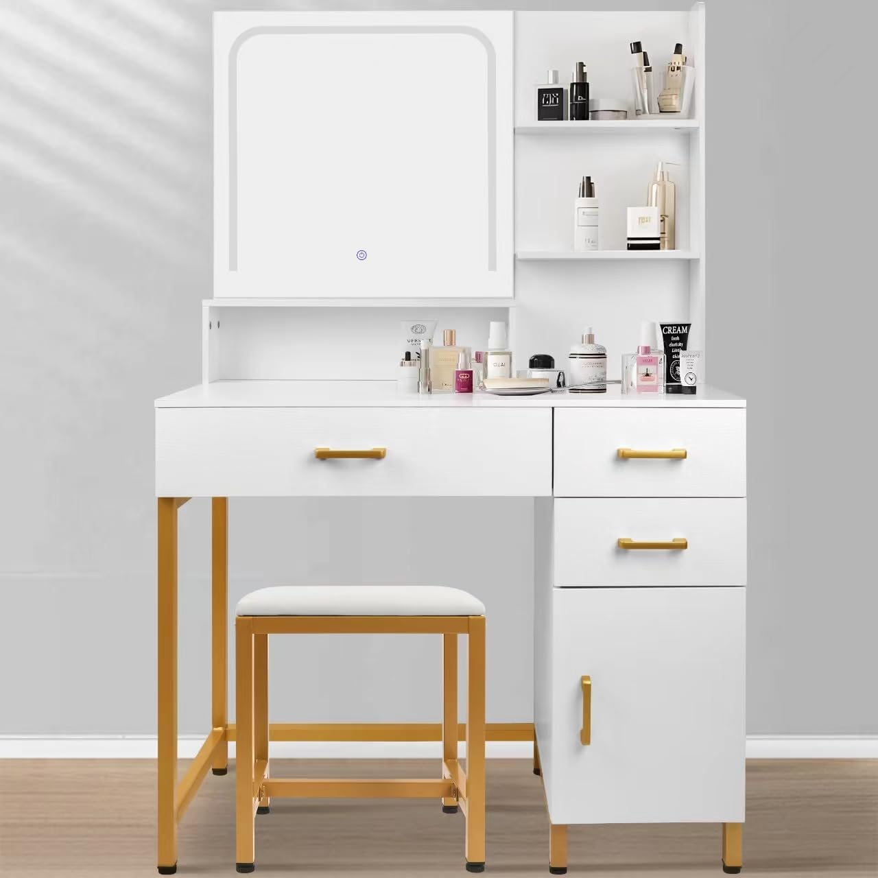 - đ·ăAmple Storage SpaceăTired of dealing with a cluttered makeup collection? Look no further! Experience the convenience of our white makeup vanity desk, designed with exceptional storage capacity. Featuring a side chest, 3 spacious drawers, a roomy tabletop, and 2 open shelves, this makeup vanity station offers abundant space for your creams, lip glosses, lipsticks, brushes, and more. Embrace the versatility provided by our side chest and keep your cosmetics organized effortlessly.