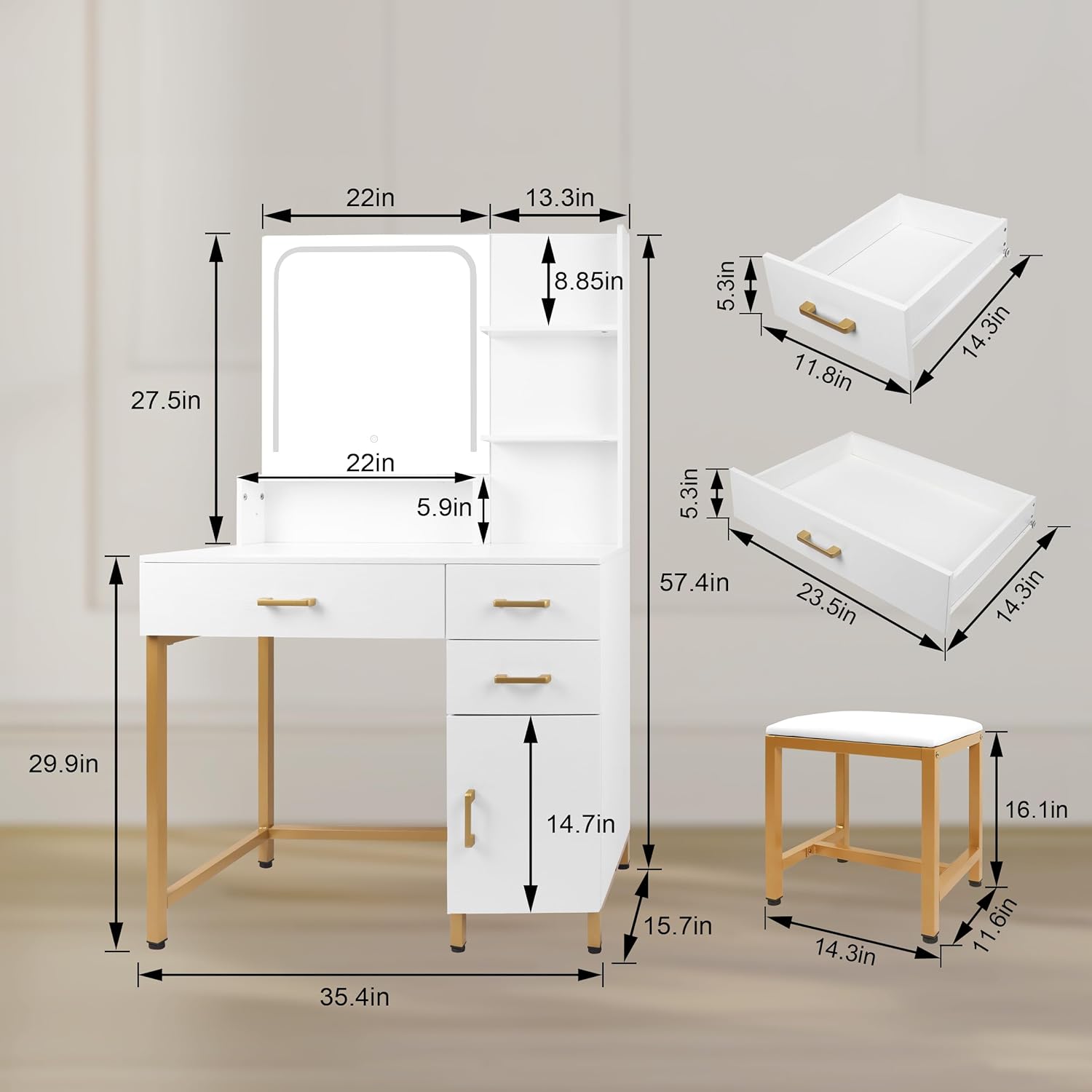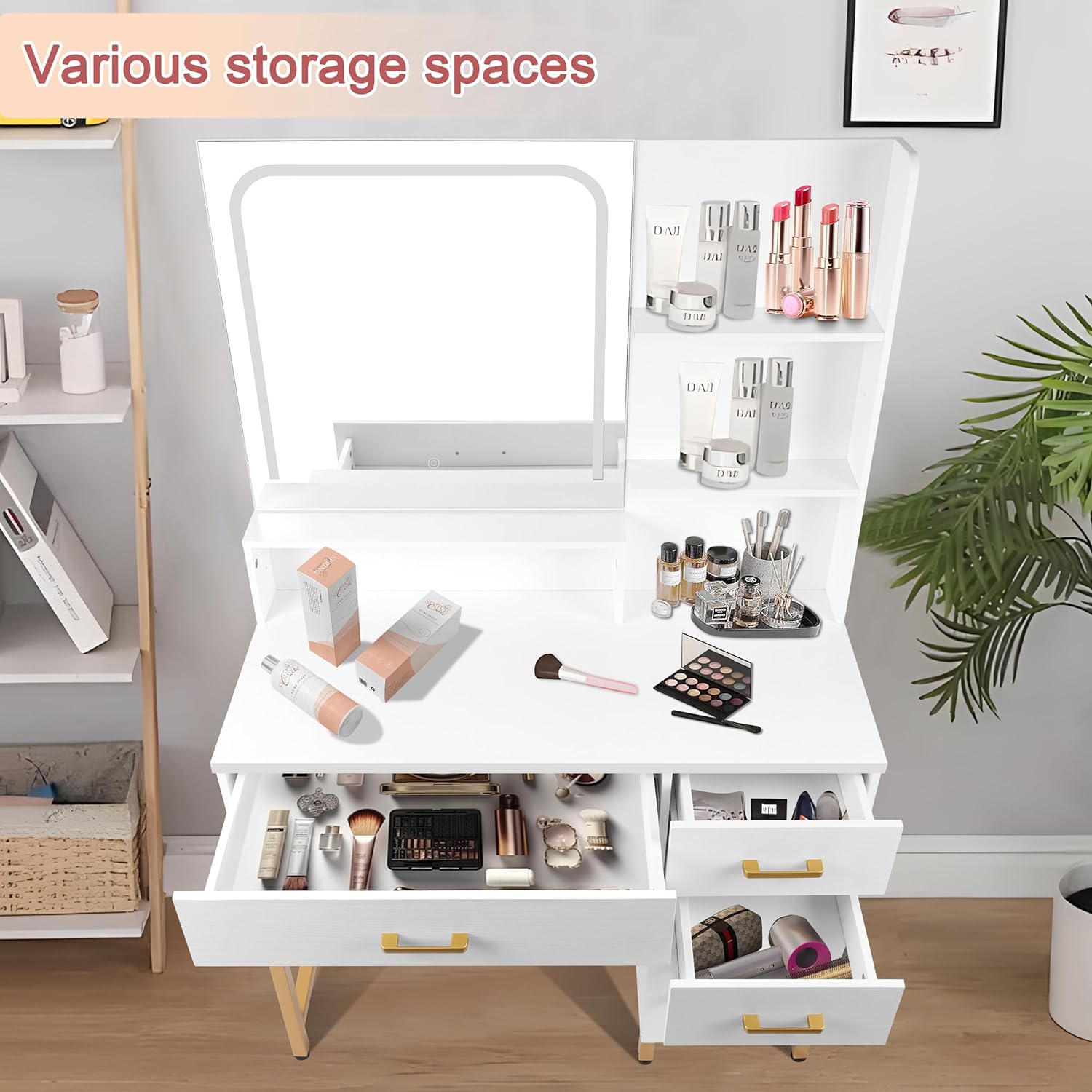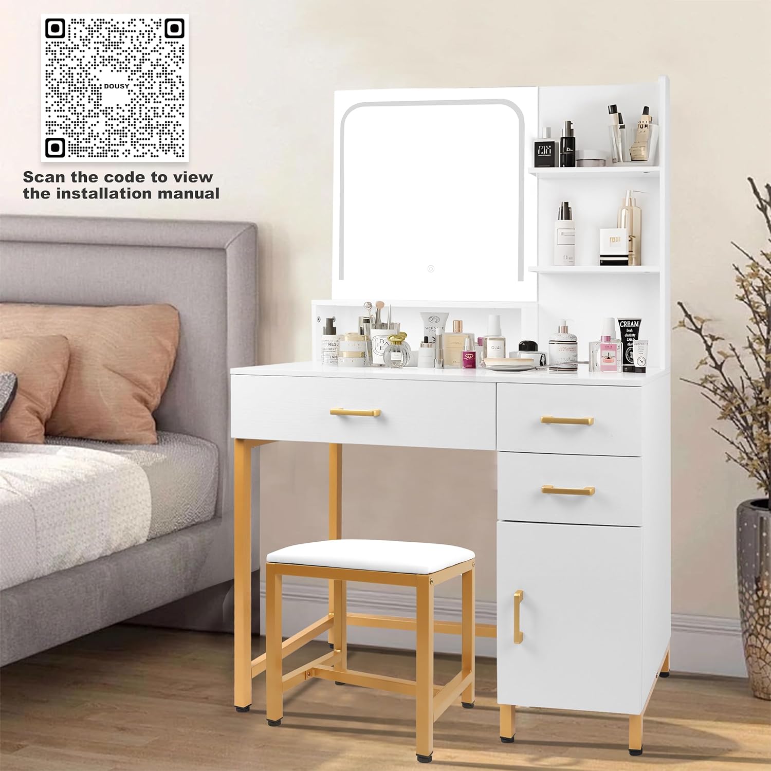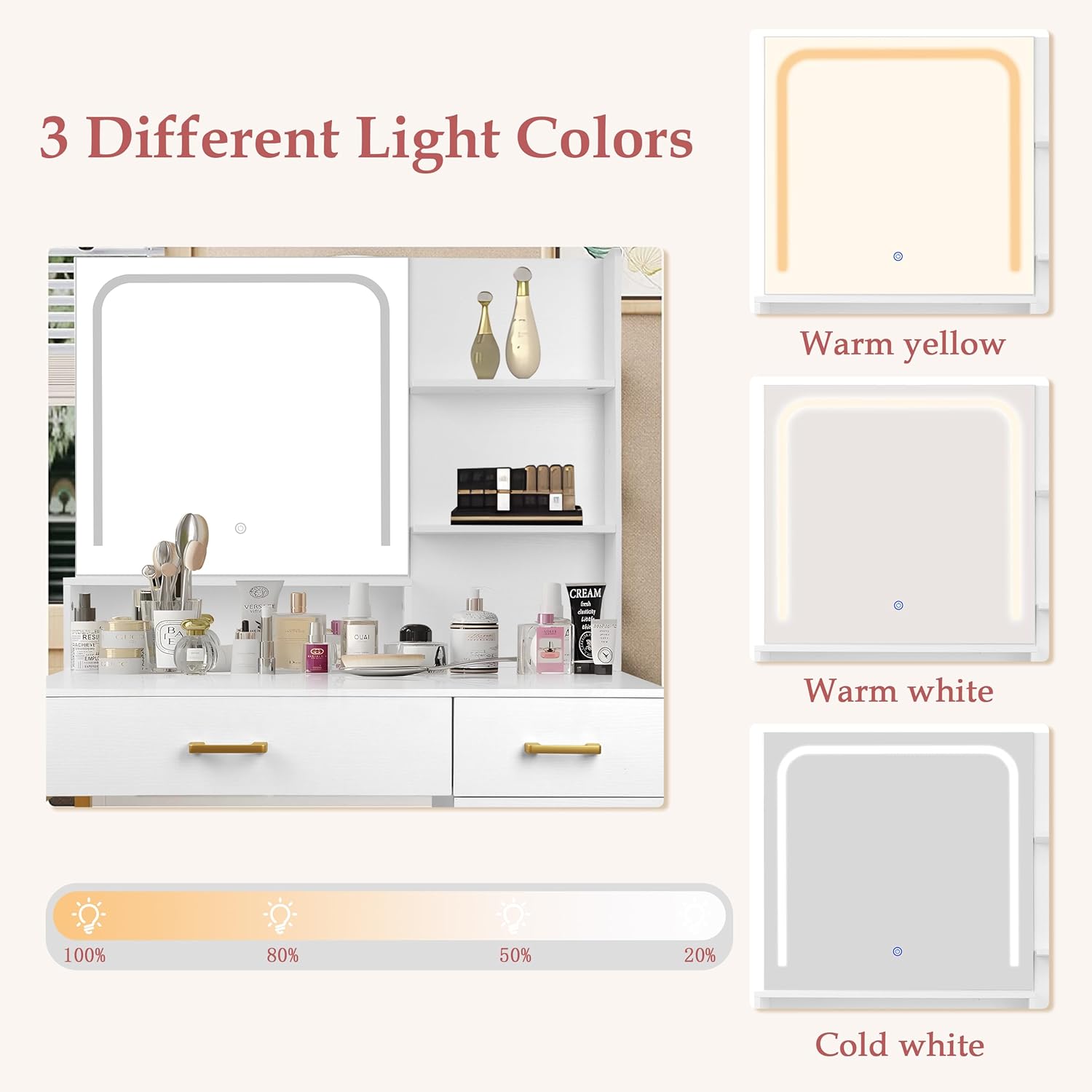 Makeup Vanity Desk with Mirror & Lights, Vanity Table Set with Storage Drawers, Shelves, Cabinet & Stool, Bedroom Dressing Table with 3 Color Light Adjustable, White