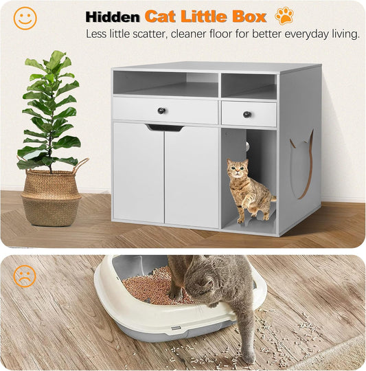 Wooden Cat Litter Box Enclosure, Hidden Litter Box Furniture Enclosed Cat Washroom Storage Cabinet with Storage Drawers, Open Compartments, Air Vents, for Living Room, Bedroom, Grey