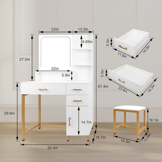 Makeup Vanity Desk with Mirror & Lights, Vanity Table Set with Storage Drawers, Shelves, Cabinet & Stool, Bedroom Dressing Table with 3 Color Light Adjustable, White