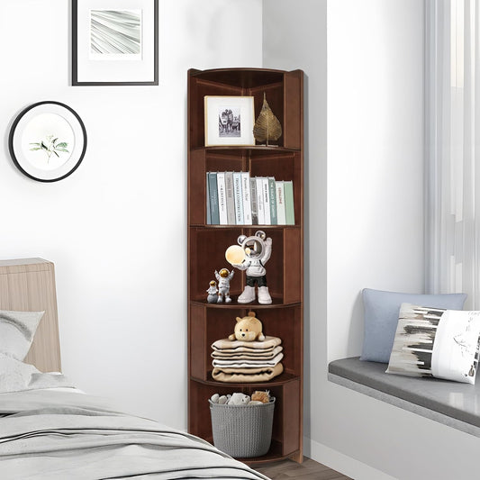 5 Tier Bamboo Corner Shelf, Modern Corner Bookshelf, 69" Tall Stylish Book Case Display Rack Plant Stand for Living Room, Bedroom, Home Office, Kitchen, Walnut