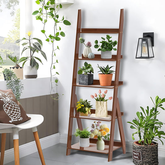 5-Tier Ladder Shelf Bookcase, Bamboo Ladder Bookshelf Leaning Bookshelf, Freestanding Storage Shelf Boho Bookshelf for Living Room, Home Office, Bedroom, Balcony, Walnut